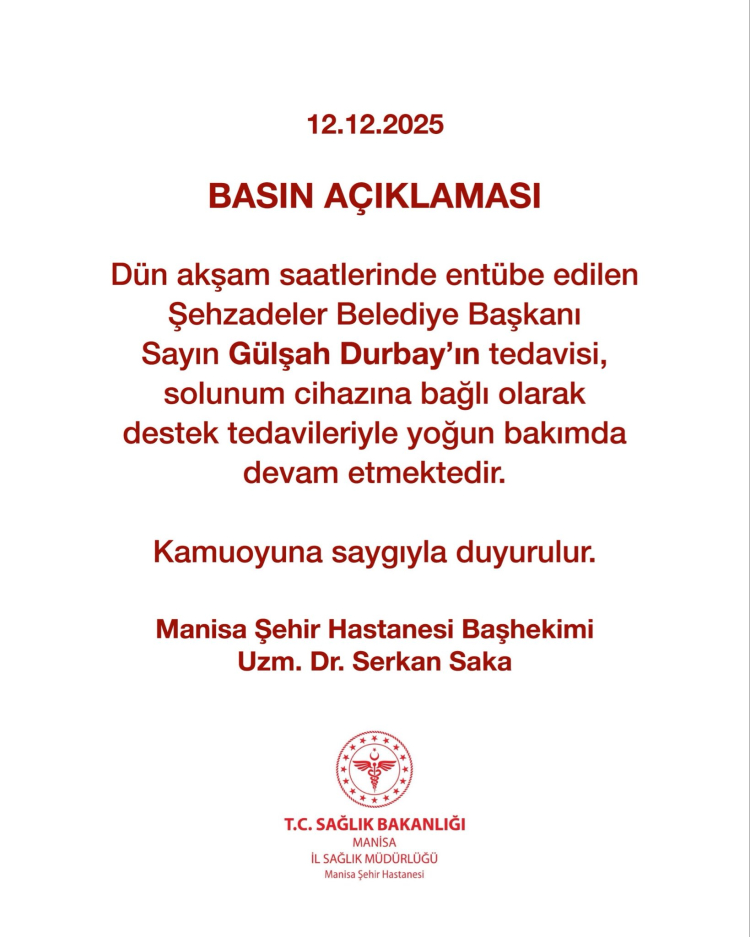 Manisa Şehir Hastanesi'nden yapılan açıklamaya göre, entübe edilen Şehzadeler Belediye Başkanı Gülşah Durbay'ın tedavisi yoğun bakımda devam ediyor.