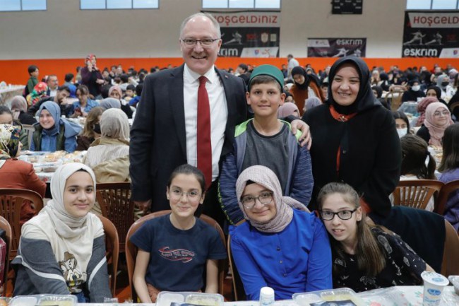 Okulun spor salonunda düzen programda yaklaşık 1000 öğrenci ve aileleri ile birlikte iftar sofrasında bir araya gelen Bilgin, masaları tek tek dolaşarak katılımlarının Ramazan ayını tebrik etti. İftarın ardından konuşan Başkan Hilmi Bilgin, "Okulumuz 6/A sınıfı öğrencilerimizden ‘Başkanım bizi iftara götürür müsünüz' diye bir teklif gelmişti. Biz de bu iftarı sadece bir sınıfımızla değil, okulumuzda öğrenim gören tüm öğretmen, öğrencilerimiz ve ailelerimizle birlikte yapalım, iftarın bereketini muhabbetini birlikte paylaşalım dedik. Muhabbet sofrasında sizlerle bir araya geldik" dedi.