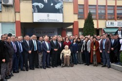 Başkan Hüseyin Uysal ve sendika temsilcileri, belediye başkan yardımcıları ve işçiler törenin ardından toplu hatıra fotoğrafı çektirdi.