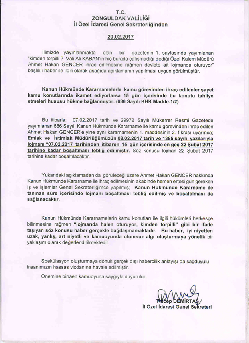 Zonguldak Valiliği, İl Özel İdare Genel Sekreterliği Kanun Hükmünde Kararname ile ihraç edilen Zonguldak Valiliği Özel Kalem Müdürü Ahmet Hakan Gencerin hala kamu lojmanında oturduğu yönündeki haberler üzerine yazılı bir açıklama yaptı.