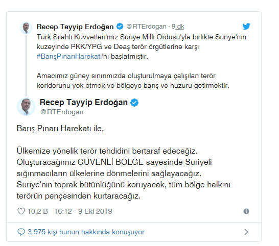 Cumhurbaşkanı Recep Tayyip Erdoğan sosyal medya hesabından "Türk Silahlı Kuvvetleri'miz Suriye Milli Ordusu'yla birlikte Suriye'nin kuzeyinde PKK/YPG ve Deaş terör örgütlerine karşı #BarışPınarıHarekatı'nı başlatmıştır" paylaşımını yaptı.