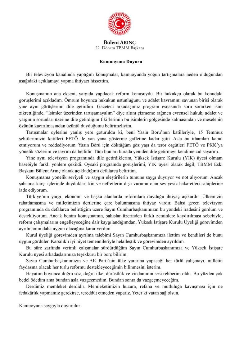 Sabah erken saatlerde görevinden alındığı açıklanan Cumhurbaşkanlığı Yüksek İstişare Kurulu üyesi Bülent Arınç, bugün sosyal medya hesabından yaptığı açıklamayla görevinden ayrılma kararı aldığını duyurdu