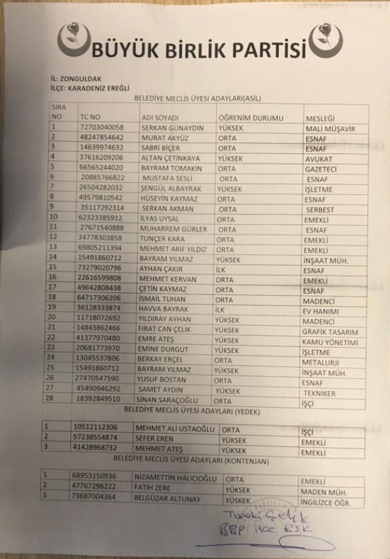Kdz.Ereğli Belediye Başkanı Hüseyin Uysal'ın listesi açıklandı..