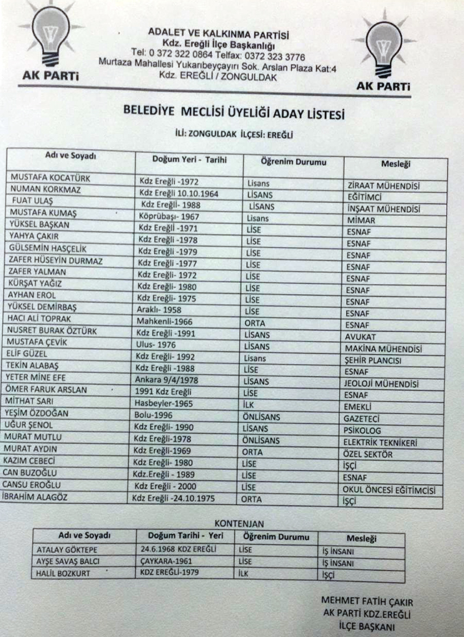 AK Parti Kdz.Ereğli Belediye Başkan adayı Erol Şahin'in listesi belli oldu..