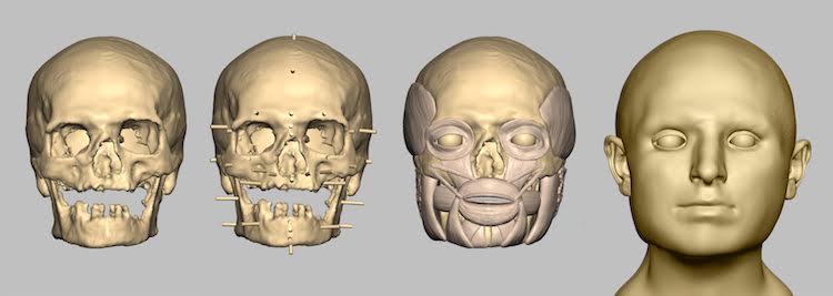 Yeniden yüzlendirme çalışmasında öncelikle yüz doku kalınlıkları veribankasından bireyin biyolojik profiline uygun olan yüz doku kalınlıkları belirlendi. Buna göre kafatasının 25 adet anatomik noktasına ait bu referans doku kalınlıkları yerleştirildi. Sonrasında yüz kasları ve yaşlanma karakteristikleri eklendi.