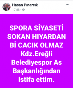 Kdz.Ereğli Belediyespor kulübünde Zafer Hoca’dan sonra As Başkan Hasan Pınarcık’ta istifa etti.