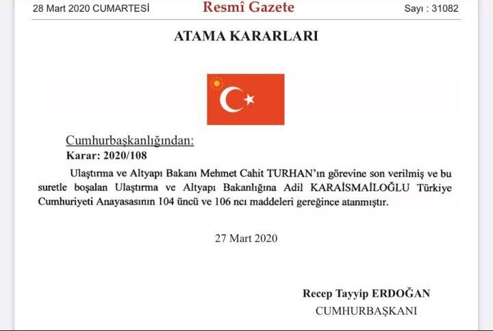 Cumhurbaşkanı Recep Tayyip Erdoğan'ın imzasıyla Resmi Gazete'de yayımlanan Atama ve Görevden Alma Kararlarına göre Ulaştırma ve Altyapı Bakanı Cahit Turan görevden alınırken yerine Adil Karaismailoğlu atandı.
