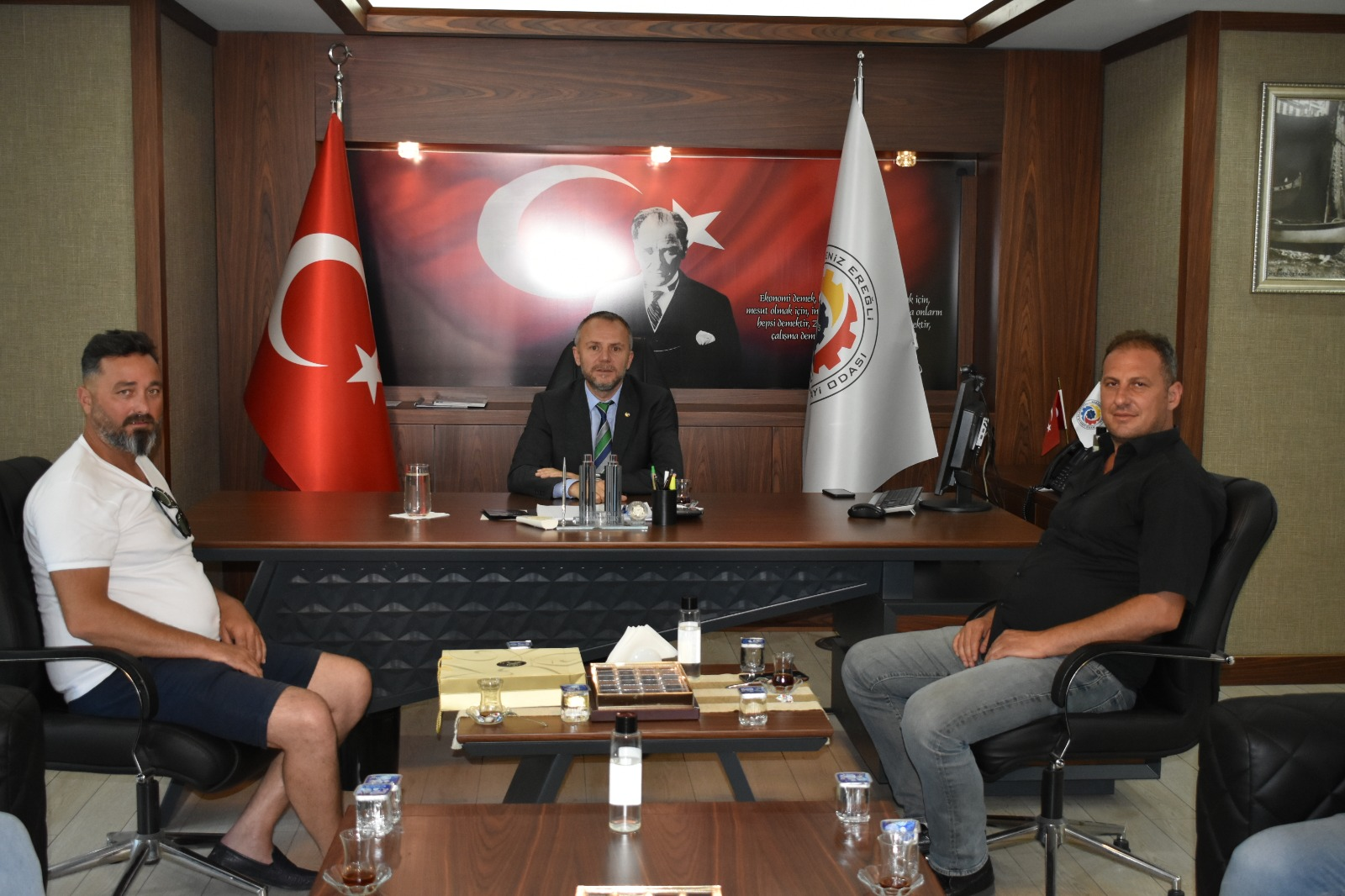 Kdz.Ereğli Su Ürünleri Kooperatifi Başkanı Murat Toprak ve Yönetim Kurulu üyesi Bora İnce, beraberinde işadamı Süleyman Danışmaz ile birlikte Kdz.Ereğli Ticaret ve Sanayi Odası Başkanı Arslan Keleş'i ziyaret etti.
