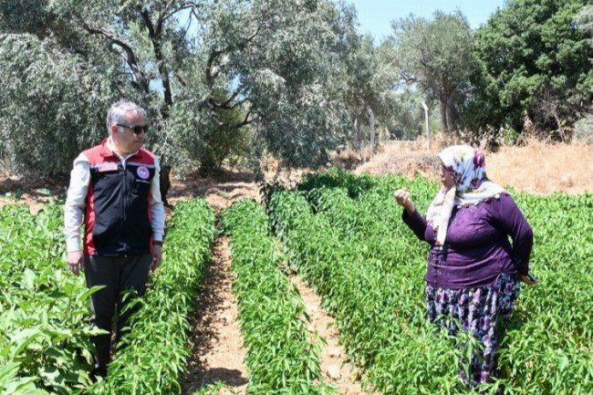 İZMİR (İGFA) - Proje kapsamında Torbalı'nın Karaot Mahallesi'nde domates, biber ve patlıcan üretimini geliştirmek amacıyla üretici Hatice Soytürk'e 1600 adet fide ve 4 kg bamya tohumu verildi. İl Tarım ve Orman Müdürü Mustafa Şahin, 2 dekar alanda üretim yapan Hatice Soytürk'ün tarlasını ziyaret ederek incelemelerde bulundu. Şahin'e, Bitkisel Üretim ve Bitki Sağlığı Şube Müdürü Engin Altunoğlu, Torbalı İlçe Tarım ve Orman Müdürü Gökhan Aktaş ve kurum personeli de eşlik etti.