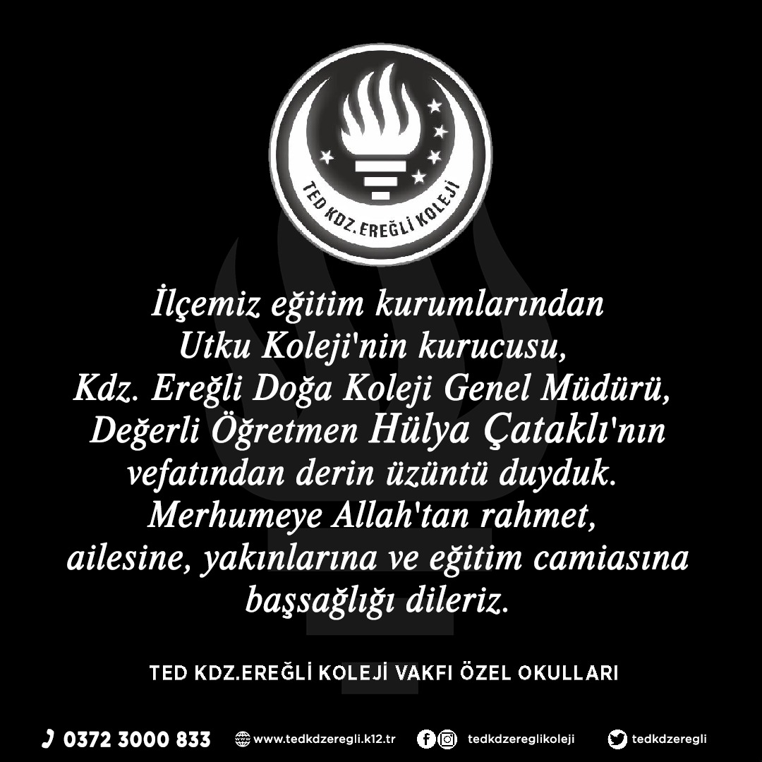 Tedavi gördüğü hastanede hayatını kaybeden UTKU Koleji kurucusu ve Kdz.Ereğli Doğa Koleji Genel Müdürü Hülya Çataklı için bir anma mesajı yayınladı..