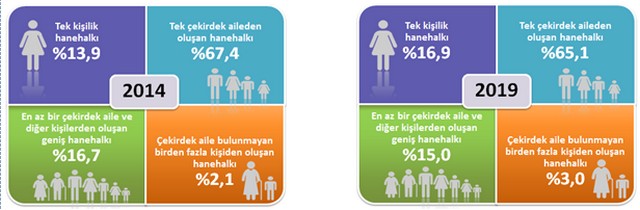 Diğer yandan geniş aile olarak tanımlanan ve en az bir çekirdek aile ve diğer kişilerden oluşan hanehalklarının oranı 2014 yılında %16,7 iken 2019 yılında %15’e düştü.