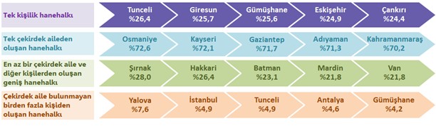 İllere göre hanehalkı tipleri incelendiğinde, 2019 yılında tek kişilik hanehalklarının oranının en yüksek olduğu ilin %26,4 ile Tunceli olduğu görüldü. Tunceli’yi %25,7 ile Giresun, %25,6 Gümüşhane, %24,9 ile Eskişehir ve %24,4 ile Çankırı izledi.