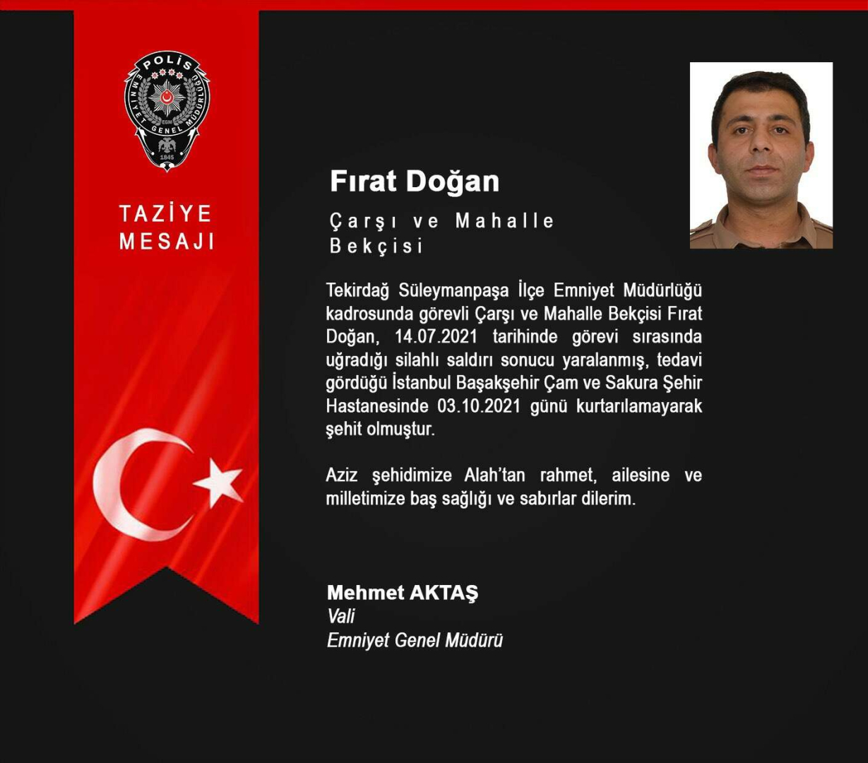 Emniyet Genel Müdürüğü (EGM), sosyal medya üzerinden Doğan'ın şehit olduğunu duyurdu. Paylaşımda, "Tekirdağ Süleymanpaşa ilçe Emniyet Müdürlüğü kadrosunda görevli Çarşı ve Mahalle Bekçisi Fırat Doğan, 14.07.2021 tarihinde görevi sırasında uğradığı silahlı saldırı sonucu yaralanmış, tedavi gördüğü İstanbul Başakşehir Çam ve Sakura Şehir Hastanesinde 03.10.2021 günü kurtarılamayarak şehit olmuştur. Aziz şehidimize Alah'tan rahmet, ailesine ve milletimize başsağlığı ve sabırlar dilerim." ifadeleri yer aldı.