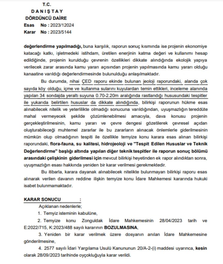 Kararı avukatları aracılığıyla Danıştay’da temyiz ettiklerini söyleyen Öztürk, “Davayı görüşen Danıştay 4. Dairesi, bilirkişi raporundaki çelişkilere dikkat çekerek, hükme esas alınabilecek nitelik ve yeterlilikte olmadığı sonucuna ulaştı. Danıştay 4. Dairesi kararında, diğer teknik tespitler ile raporun sonuç bölümü arasındaki çelişkinin giderilmesi için mevcut bilirkişi heyetinden ek rapor alındıktan sonra, uyuşmazlığın esası hakkında yeniden bir karar verilmesi gerektiğine hükmetti. Şimdi bilirkişi ek rapor verecek ve dava yeniden görülmeye başlayacak. ‘Ankara’da hâkimler vardır’ dedirten bu karar, doğasını koruma çabasındaki biz ekolojistleri çok mutlu etti. Israrla davasının peşinden koşan Çaycuma doğa gönüllülerine, bizle birlikte dava açan TMMOB Mimarlar Odası Ankara Şubesine, Avukatlarımız Yakup Okumuşoğlu ve Gökçe Bolat’la sürece destek veren tüm dostlarımıza sonsuz teşekkür ediyorum. Bundan sonrasını doğa düşmanı yatırımlarla bölgemizi yaşanmaz kılmaya adeta ant içmiş paragözlerle işbirlikçileri düşünsün.” diyerek tamamladı.