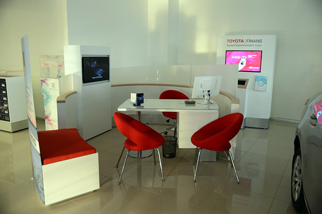 Örneğin; Showroom’a giren müşterimiz, almak istedikleri araç üzerinde bulunmasını arzu ettikleri çeşitli aksesuarları, özel ekran vasıtası ile sanal ortamda kendileri araca yerleştirip görme imkanına sahipler.Hatta, evlerinde dahi akıllı telefonlar vasıtası ile TOYOTA sitesinde oluşturdukları görseli, showroomdaki ekranımıza yansıtıp, ‘ben bu aracı, bu şekilde istiyorum’ diyebiliyor.Müşterilerimiz, Toyota Finans ekranından kredi başvurularını sorgulayabilecek. ‘Olmazsa olmazımız’ saydığımız Hibrit’i anlatan sürekli aktif ekran mevcut.”