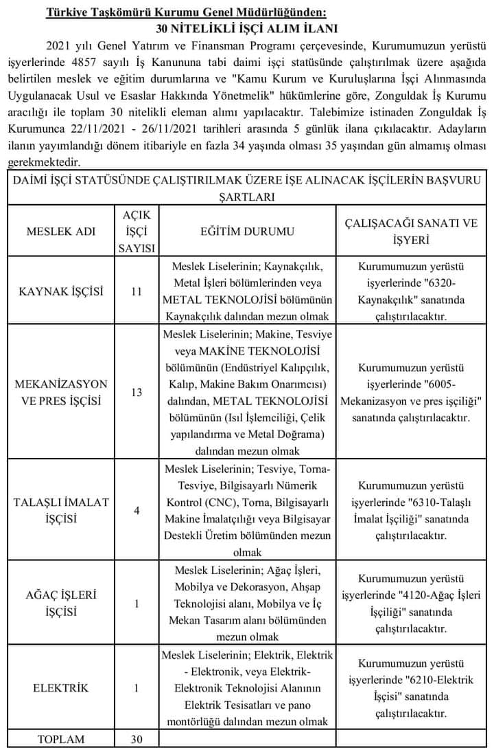 Türkiye Taşkömürü Kurumunun, 35 nitelikli personel alacağı bildirildi.