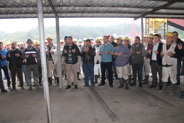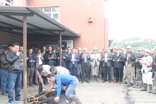 Kazasız ve belasız üretim için ve maden şehitleri için okunan Kur-an ve duaların ardından madenciler tarafından getirilen tekbirlerle kurban kesildi.