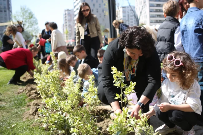 Bursa Nilüfer Belediyesi'nin kente yeni kazandırdığı 23 Nisan Parkı'nın bitkilerini, kreş öğrencileri dikti. Çocuklar, çiçek ve süs bitkilerini toprakla ..