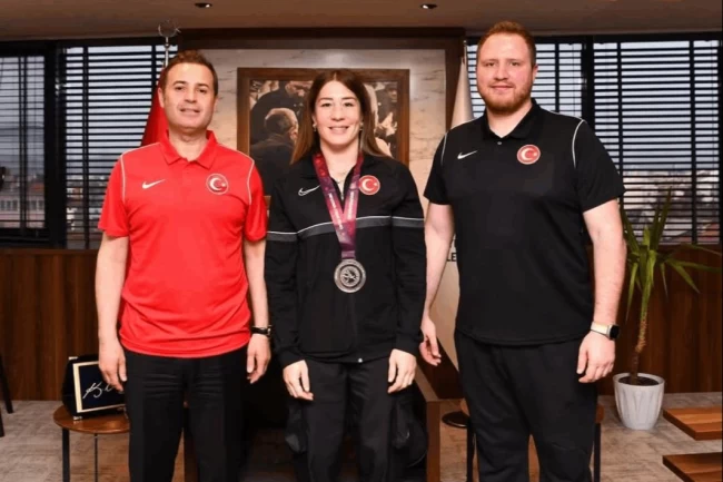 Balıkesir Büyükşehir Belediye Başkanı Ahmet Akın, 2025 Avrupa Güreş Şampiyonası'ndan gümüş madalyayla dönen mili gururumuz Yasemin Adar Yiğit'i makamında ..