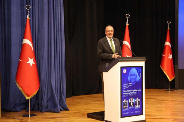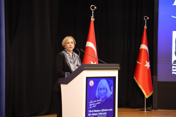 "Sözlerime başlamadan önce, vefatının ikinci yıl dönümünde ilim camiamızın muazzez isimlerinden mütefekkir, yazar ve Üniversitemizden fahri doktoralı ailemizin değerli üyesi Alev Alatlı Hocamızı huzurlarınızda rahmet, saygı ve özlemle yâd ediyorum. Ruhu şâd, mekânı cennet olsun. Üniversitemiz ev sahipliğinde düzenlediğimiz bu anlamlı programda sizleri aramızda görmekten büyük bir bahtiyarlık duyuyorum. Bugün burada yalnızca bir düşünce insanını anmıyoruz; fikirleriyle yolumuzu aydınlatan, cesaretiyle bizlere örnek olan müstesna bir münevveri, Türk düşünce hayatının vicdan nöbetçilerinden Alev Alatlı’yı anmak üzere bir araya gelmiş bulunuyoruz. Cumhurbaşkanımız Sayın Recep Tayyip Erdoğan’ın da ifade ettiği gibi, o; Türkiye merkezli düşüncenin öncülerinden, son asırda yetişmiş en üretken, en cesur ve en hakikatperver kadın münevverlerimizden biriydi. Büyük mütefekkir Cemil Meriç’in deyimiyle ise kendi semasında tek yıldızdı. Filistin’in yalnızlaştırıldığı dönemlerde, saygın bir entelektüelin hiçbir tereddüt göstermeden hakikatin safında dimdik durması, onun karakterinin ve inancının en güçlü tezahürlerinden biriydi. O, susmayı değil konuşmayı; seyretmeyi değil sorumluluk almayı seçti. Sözlerime son verirken; bizleri Alev Alatlı’nın hatıralarında buluşturacak olan kıymetli Rektör Hocamıza ve Sayın Prof. Dr. Ömür Ceylan’a, ayrıca bugün aramızda bulunarak üniversitemizi onurlandıran merhume Alev Alatlı’nın değerli evladı Sayın Funda Firuz Aktan Hanımefendi’ye gönülden teşekkür ediyorum.