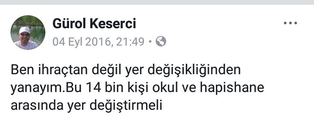 Geçtiğimiz gün Kdz.Ereğli'deki Eğitim sistemi ile ilgili yaptığı açıklamayla dikkatleri üzerine çeken Kdz.Ereğli Türkiye Eğitim Sen ilçe temsilcisi Gürol Keserci'nin FETÖ ve PKK Terör Örgütüne üye olması nedeniyle MEB'den ihraç edilen eğitim görevlilerine hitaben 'Ben ihraçtan değil, yer değişikliğinden yanayım', paylaşımı kafalarda soru işareti bıraktı..