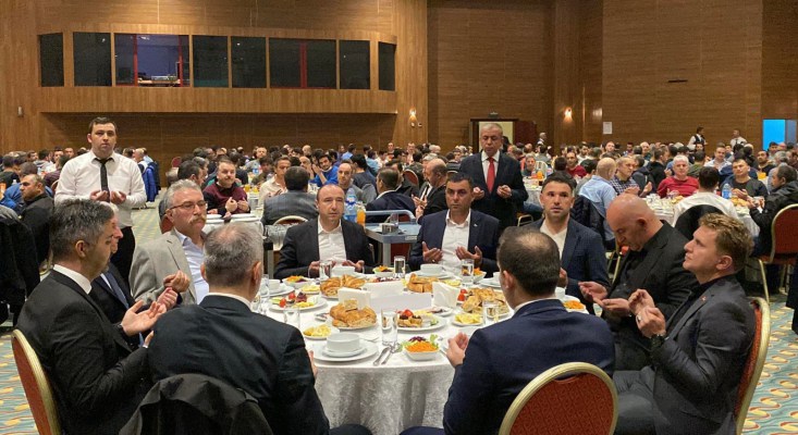 Gülüç Beldesindeki Büyük Anadolu Ereğli Otel’de gerçekleştirilen iftara katılan Türk Metal Sendikası Genel Başkan Yardımcısı Halil Faki Erdal, Otel binası avlusunda işçilerin oluşturduğu uzun kuyrukta; sloganlar, konfetiler ve meşalelerle karşılandı.