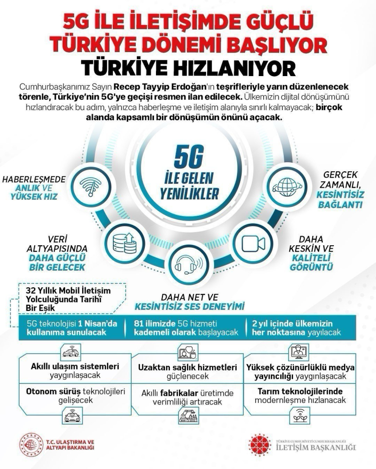 Açıklamada, 5G'nin sadece haberleşme alanında değil; akıllı şehir uygulamaları, savunma sanayii, sağlık ve ulaştırma gibi birçok sektörde önemli dönüşümlere kapı aralayacağı kaydedildi.