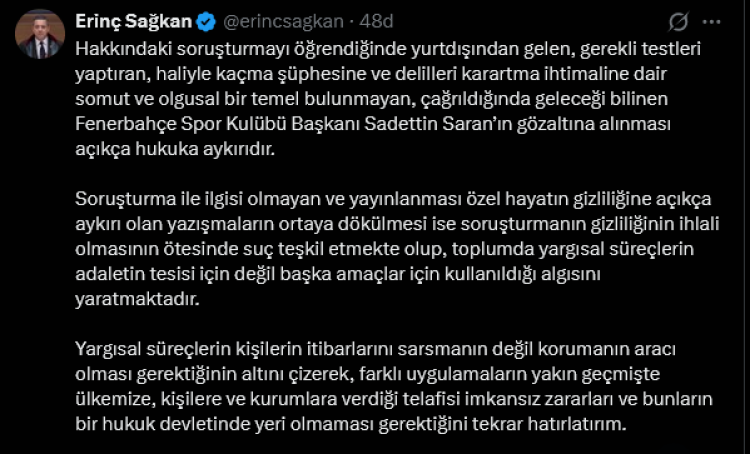 Türkiye Barolar Birliği Başkanı Erinç Sağkan, Fenerbahçe Spor Kulübü Başkanı Sadettin Saran'ın gözaltına alınmasına sert tepki göstererek, yargısal süreçlerin itibarı zedeleyen bir araca dönüştürülmemesi gerektiğini vurguladı.