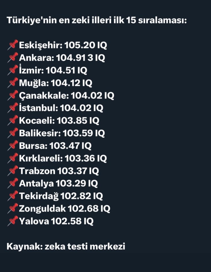 Buna göre Eskişehir 105.20 IQ ile en zeki il olurken; Zonguldak 102.68 ile listede 14. Sırada yer aldı.