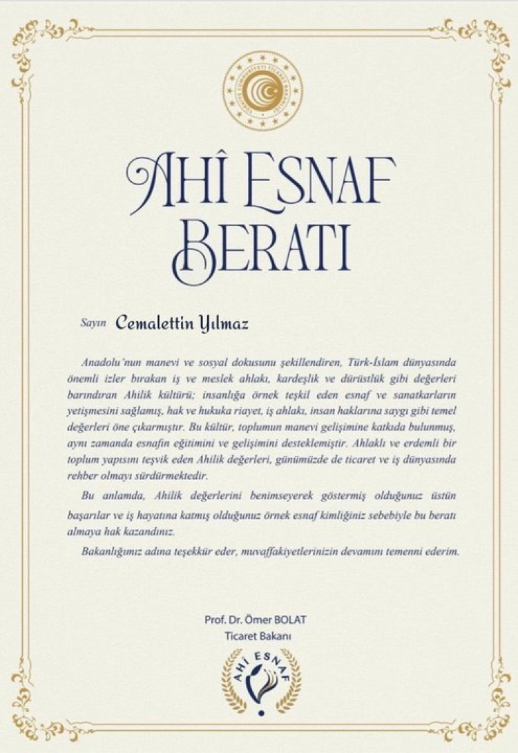 Ücret almayan esnafa Bakan Bolat'tan "Ahi Esnaf Beratı"