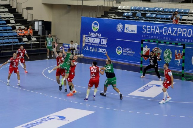 SAKARYA (İGFA) - Sakarya Büyükşehir Belediyesi'nin ev sahipliği yaptığı SEHA Gazprom Ligi'nin dostluk turnuvasında ilk gün geride kaldı. Serdivan Spor Salonu'nda turnuvanın açılış seremonisinin ardından oynanan karşılaşmalarda Meshkov Brest ve Veszprem takımları rakiplerini mağlup ederek final oynamaya hak kazandı. Heyecan dolu karşılaşmaları Büyükşehir Belediye Başkanı Ekrem Yüce'nin yanı sıra Kulüp Başkanı Cevat Ekşi, Gençlik ve Spor İl Müdürü Nevzat İnanç, kulüp yetkilileri ve çok sayıda sporsever takip etti.