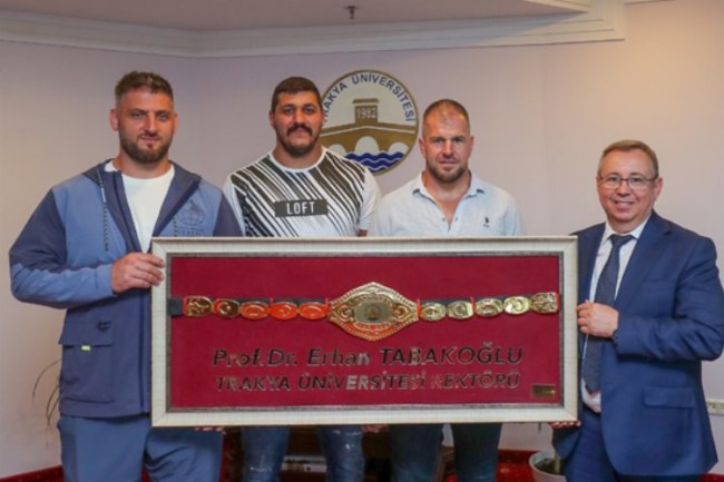 Yavuz Sönmez eşliğinde Trakya Üniversitesi'nde öğrenim gören başpehlivanlardan Nedim Gürel, Semih Turgut ve Tanju Gemici, özel kontenjanlarla Türkiye'de pehlivanlara yükseköğretimin kapılarını açan Trakya Üniversitesi Rektörü Prof. Dr. Erhan Tabakoğlu'na tarihî miras Kırkpınar'a ve ömrünü ata sporuna adamış pehlivanlara verdiği desteklerden ötürü sembolik altın kemer takdim etti.