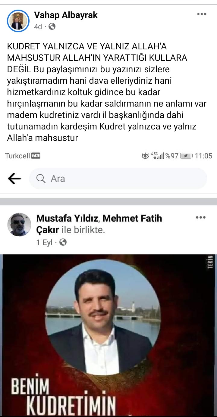 "Bu paylaşımınızı bu yazınızı sizlere yakıştıramadım hani dava elleriydiniz hani hizmetkardınız koltuk gidince bu kadar hırçınlaşmanın bu kadar saldırmanın ne anlamı var madem kudretiniz vardı il başkanlığında dahi tutunamadın kardeşim Kudret yalnızca ve yalnız Allah'a mahsustur"