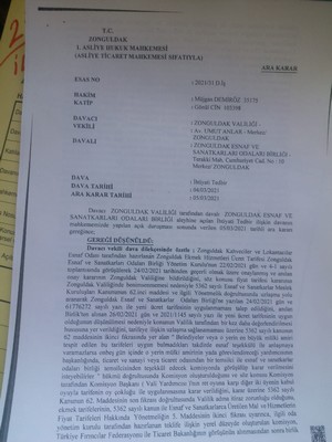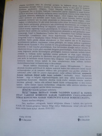 "Ekmek zammı üzerine. Esnaf odası Ticaret Odası vali yardımcısı başkanlığında bir komisyon oluşturuldu. 2’ye bir onlar zammın devam etmesini istediler. Biz de mahkemeye başvurduk. Önce İhtiyati tedbir kararı alın, yürütmesini durdurun dedik. Aynı zamanda da buna itiraz ediyoruz. Mahkeme, yürütmeyi durdurma kararı aldı bir şekilde. İdari davalarda yürütmeyi durdurma deniyor. Adli davalarda ihtiyati tedbir kararı deniyor buna. Ama bize bildirilmedi. Cuma günü'ne denk geldiği için. O kararın bir örneğini arkadaşlar bana attılar.