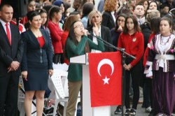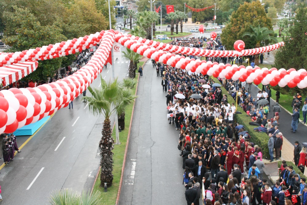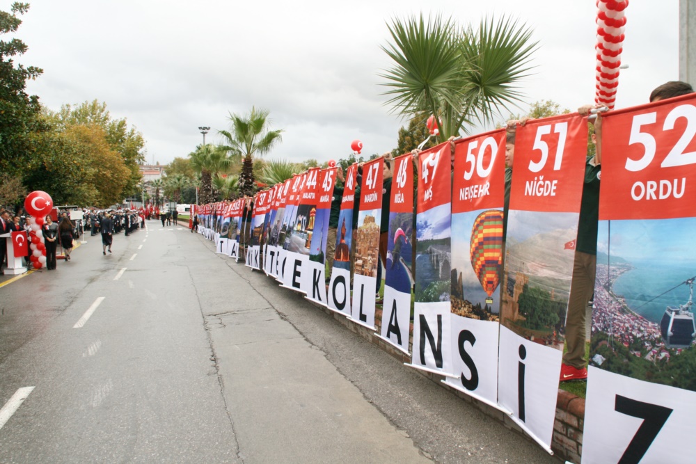 Tören hazırlıkları kapsamında öğrenciler tarafından 81 ilin plakasının ve önemli turistik değerlerinin fotoğrafları bulunan dövizlerle gösteri yaptı. 81 öğrencinin taşıdığı dövizlerde bulunan harflerle Cumhuriyetin kurucusu Gazi Mustafa Kemal Atatürk’ün “Cumhuriyeti biz kurduk, onu yaşatacak ve yükseltecek olan sizlersiniz” cümlesi oluşturuldu.