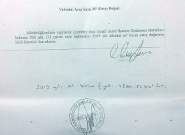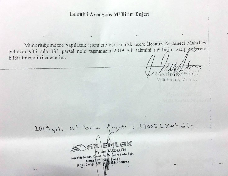 Ereğli’de bir hareket başlamış. Birileri devreye girmiş, yeniden fiyat belirleyeceğiz, demişler. 5 emlakçı bulmuşlar. Bunlara yukarıdan talimat gelmiş, bunlara da gelmişler ikinci kez fiyat teklifi verilmiş. Niyetleri, Halil Posbıyık’ı hırsızlık yaptı gibi lanse etmek… Buranın metrekaresini 1800 TL yapmış o emlakçılar… Böylece 224 bin liraya çıkarmışlar burayı. Biz 115 bin lira ödemişiz.