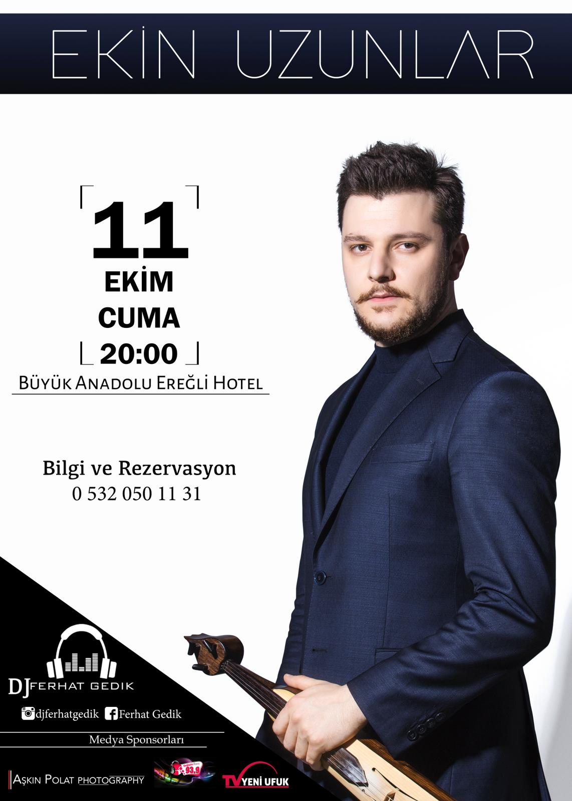 Karadeniz müziğini batı müziği ile harmanlayan ünlü sanatçı Ekin Uzunlar, Yeni Ufuk TV ve Aşkın Polat Photography sponsorluğunda 11 Ekim Cuma günü saat: 20.00'de Gülüç Büyük Anadolu Otel'e konser verecek.. Bilgi ve rezervasyon için 0 532 050 11 31'i arayabilirsiniz..