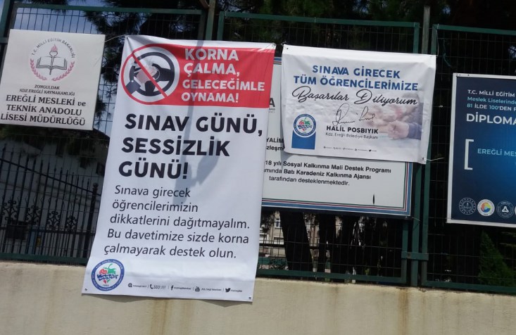 Kdz. Ereğli Belediyesi hafta sonu 3 aşamada yapılacak olan YKS öncesi kentte sınav yapılacak okulları dezenfekte ediyor. Okul çevrelerine ayrıca sessizliğe dikkat çeken afişler asıldı.