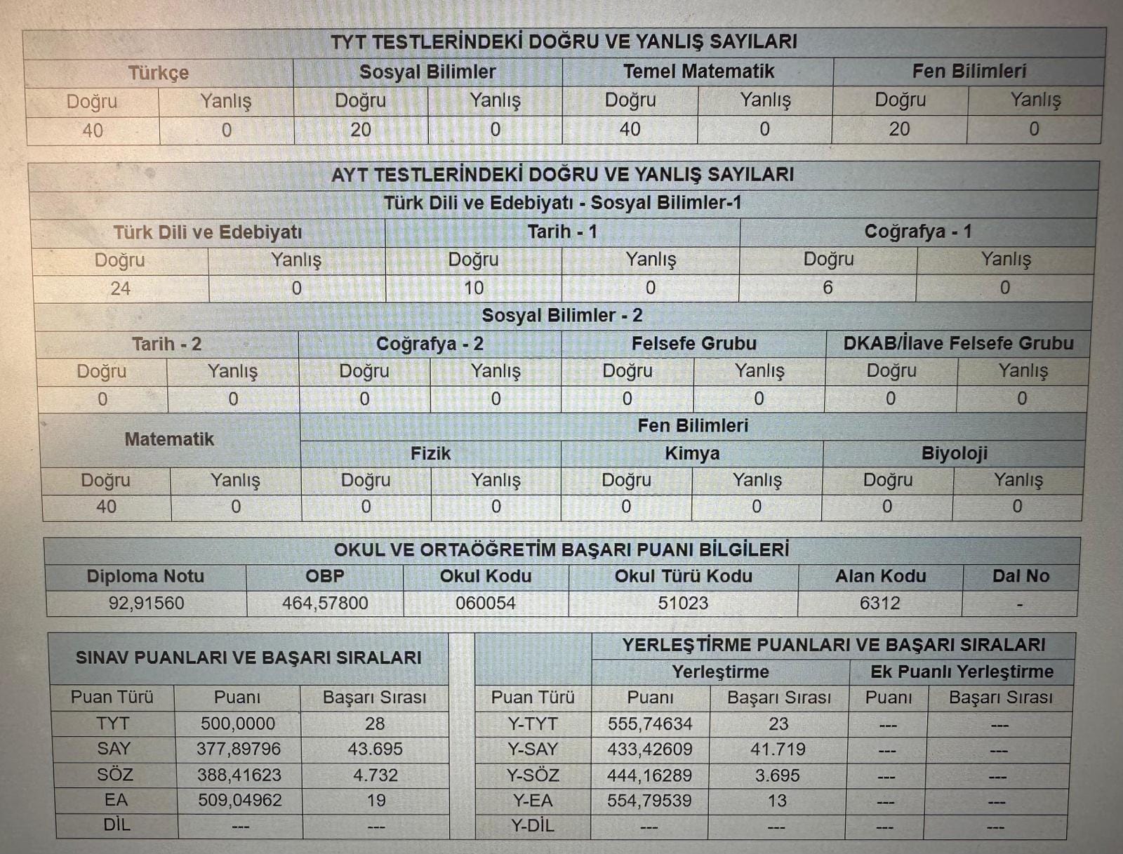 Ankara Çankaya Ümitkköy Kız Anadolu İmam Hatip lisesinde okuyan Liva Nur Coşkun, TYT testlerinden Sosyal Bilimler dersinden 20 Doğru 0 Yanlış, Temel Matematik'ten 40 Doğru 0 Yanlış, Fen Bilimleri'nden 20 Doğru 0 Yanlış ve AYT testlerinden Türk Dili ve Edebiyatı dersinden 24 Doğru 0 Yanlış Tarih'den 10 Doğru 0 Yanlış ve Coğrafya'dan 6 Doğru 0 Yanlış yaparak; tüm sorulara eksiksiz yanıt verdi.