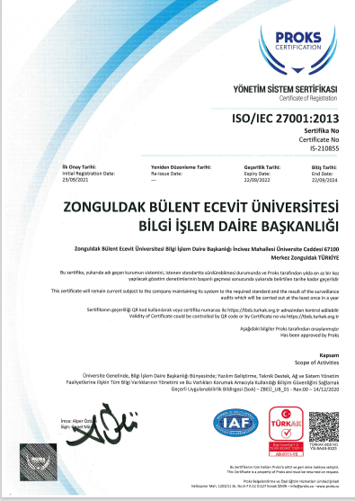 Zonguldak Bülent Ecevit Üniversitesi Bilgi İşlem Daire Başkanlığı, Proks Belgelendirme ve Özel Eğitim Hizmetleri Limited Şirketi Tarafından yapılan denetimlerde, uyguladığı Bilgi Güvenliği Yönetim Sistemi ISO 27001 standardına uygunluğunun belirlenmesiyle, Uluslararası Belgelendirme ve Gözetim Onayı ile Türk Akreditasyon Kurumu (TÜRKAK) onaylı ISO 27001:2013 Bilgi Güvenliği Yönetim Sistemi Sertifikasını almaya hak kazanmıştır.