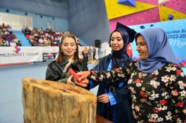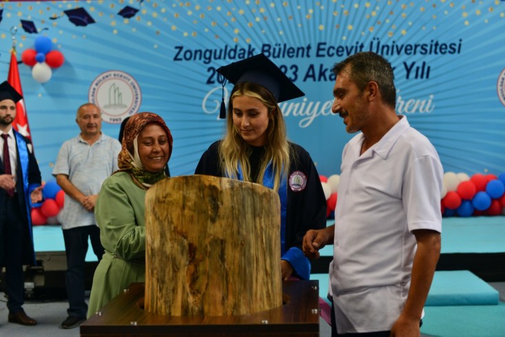 Konuşmalardan sonra tören Zeynep Arslan’ın mezuniyet kütüğüne plaket çakması ve ardından kendisine başarı belgesi ve plaket takdim edilmesi ile devam etti.