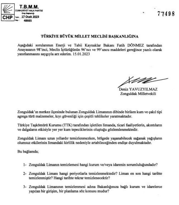 CHP Zonguldak Milletvekili Deniz Yavuzyılmaz’ın "Zonguldak Limanı'nın temizlenmesi" konusuyla alakalı önergesine bakanlıktan yanıt geldi.