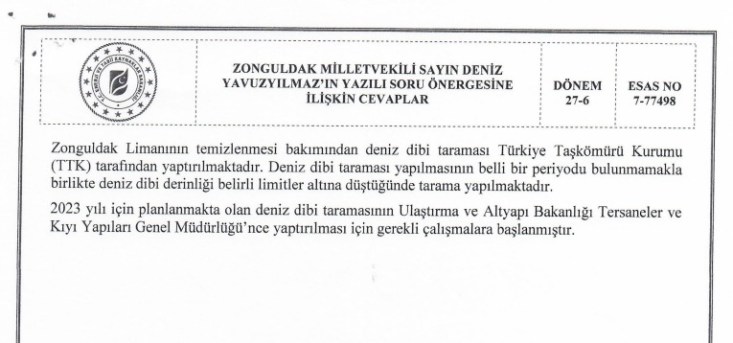 Bakan Fatih Dönmez imzasını taşıyan yanıtta, işletilen Limanın dip derinliğinin belirlenen limitlerin altına düştüğü kabul edilirken, deniz dibi tarama faaliyetlerinin 2023 yılı içinde planlandığını aktarıldı. Çalışmaların Ulaştırma ve Altyapı Bakanlığı Tersaneler ve Kıyı yapıları Genel Müdürlüğünce yapılacağından bahsedilen 15.03.2023 tarihli yanıtta özetle şu ifadeler yer aldı: “Zonguldak Limanının temizlenmesi bakımından deniz dibi taraması Türkiye Taşkömürü Kurumu tarafından yaptırılmaktadır. Deniz dibi taramasının belli bir periyodu bulunmamakla birlikte deniz dibi derinliği belirli limitler altına düştüğünde tarama yapılmaktadır. 2023 yılı için planlanmakta olan deniz dibi taramasının Ulaştırma ve Altyapı Bakanlığı Tersaneler ve Kıyı yapıları Genel Müdürlüğünce yapılması için gerekli çalışmalara başlanmıştır.”