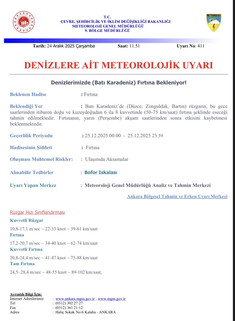 24 Aralık 2025 Çarşamba günü saat 11.51’de yayımlanan meteorolojik uyarıya göre; Batı Karadeniz’de, özellikle Düzce, Zonguldak ve Bartın çevrelerinde rüzgârın bu gece saatlerinden itibaren doğu ve kuzeydoğu yönlerden 6 ila 8 kuvvetinde (50-75 km/saat) fırtına şeklinde eseceği tahmin ediliyor.