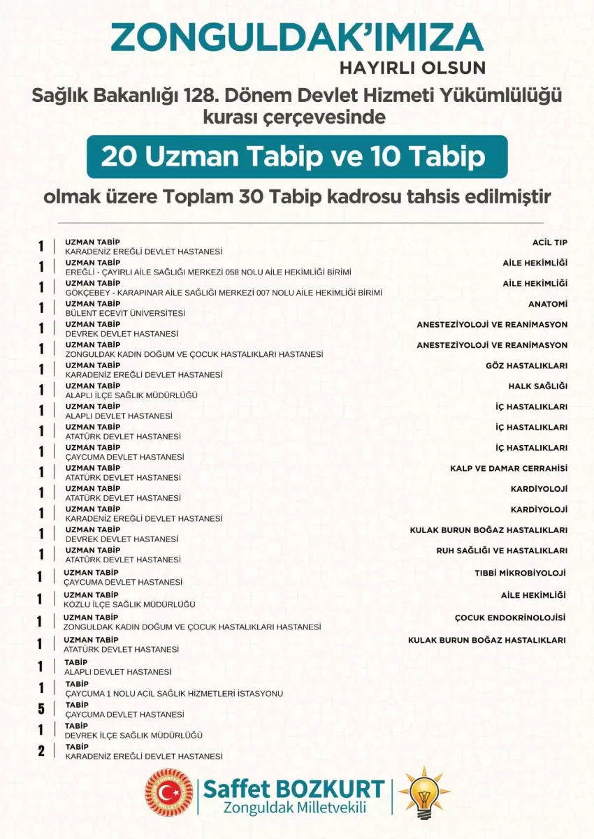 Sağlık Bakanlığı'mız tarafından 128. Dönem "Devlet Hizmet Yükümlülüğü" (DHY) kapsamında, Zonguldak’ımıza 20 Uzman Tabip, 10 Tabip olmak üzere toplam 30 Tabip kadrosu tahsis edilmiştir.