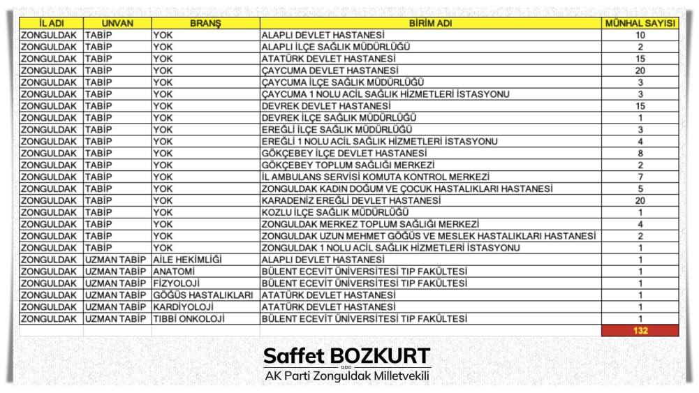 AK Parti Zonguldak Milletvekili Saffet Bozkurt, Sağlık Bakanlığı tarafından Zonguldak'a 6 Uzman Hekim ve 126 pratisyen hekim olmak üzere 132 doktor atanacağının müjdesini verdi