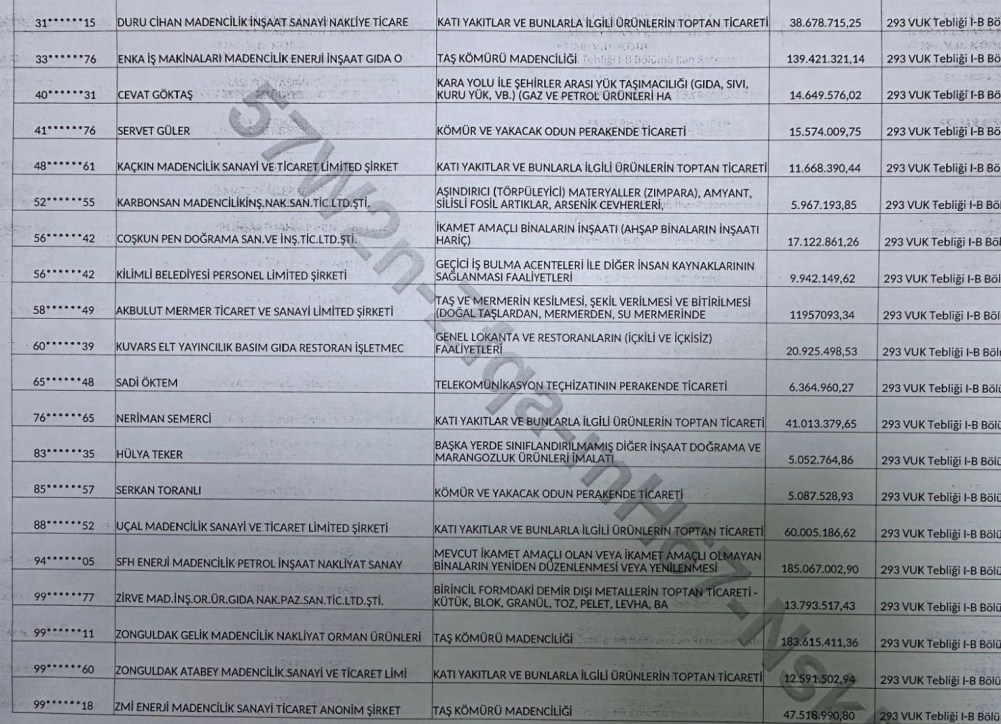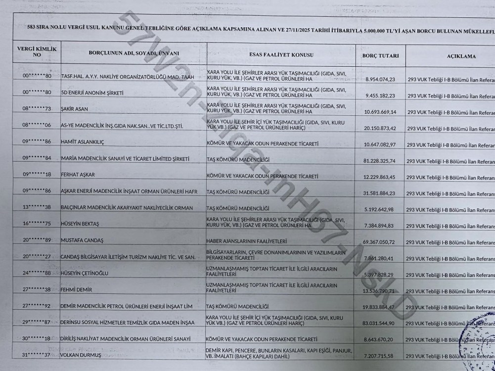 Liste, borç miktarları, mükellef türleri ve faaliyet alanları açısından dikkat çekti. Defterdarlık tarafından paylaşılan listeler şu şekilde;