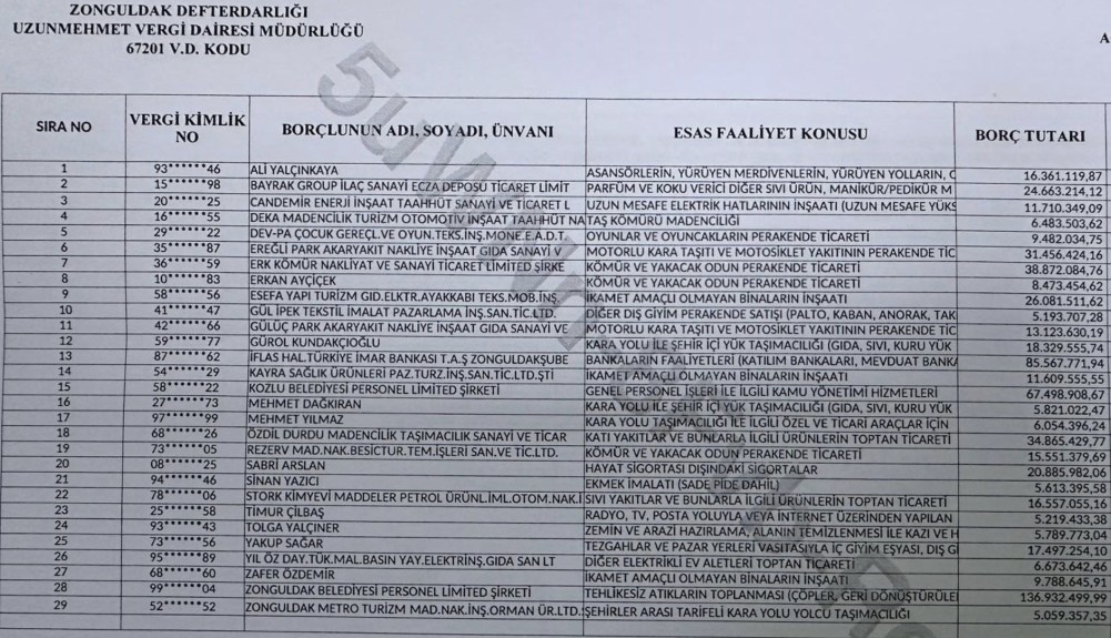 Zonguldak Defterdarlığı Uzunmehmet Vergi Dairesi Müdürlüğü, Vergi Usul Kanunu’nun 105. maddesi kapsamında, 5 milyon TL ve üzeri vergi borcu bulunan mükelleflerin listesini kamuoyuna duyurdu.