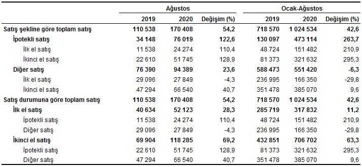 Ocak-Ağustos döneminde 1 milyon 24 bin 534 konut satışı gerçekleşerek, bir önceki yılın aynı dönemine göre %42,6 artış gösterdi. Ocak-Ağustos döneminde ipotekli konut satışı %263,7 artarak 473 bin 114, diğer satış türlerinde ise %6,3 azalarak 551 bin 420 oldu. Bu dönemde ilk defa satılan konutlar %11,2 artarak 317 bin 832 oldu. İkinci el konut satışları %63,3 artarak 706 bin 702 olarak gerçekleşti.