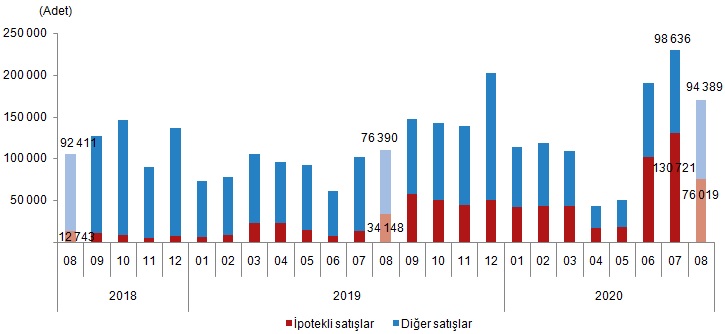 Türkiye genelinde ipotekli konut satışları 2020 Ağustos ayında bir önceki yılın aynı ayına göre %122,6 artarak 76 bin 19 oldu. Toplam konut satışları içinde ipotekli satışların payı %44,6 olarak gerçekleşti. İpotekli satışlarda İstanbul 15 bin 367 konut satışı ve %20,2 pay ile ilk sırayı aldı. İpotekli konut satışının en az olduğu il 2 konut ile Hakkari oldu.
